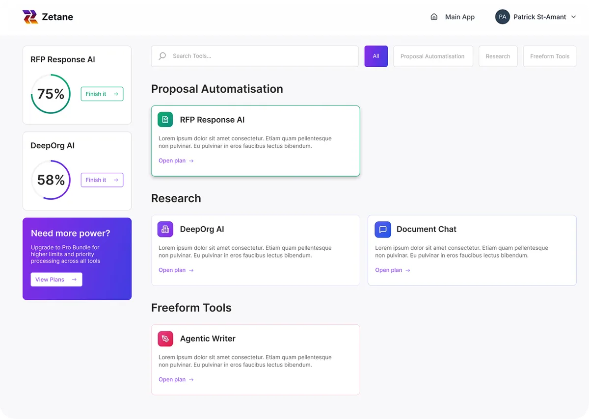 Zetane document intelligence is built for organizations managing complex RFPs, contracts, specifications, policies, and compliance documents every day. The platform delivers AI-powered workflows that streamline extraction, analysis, decision support, and document generation.